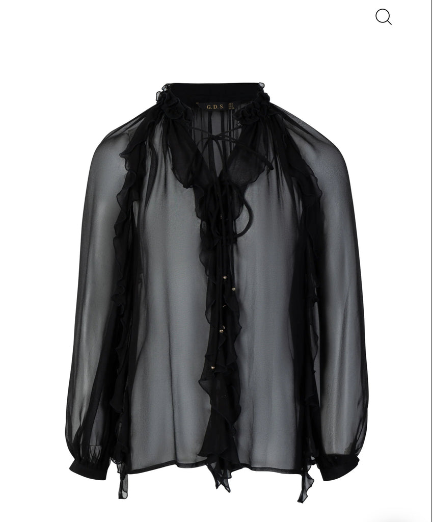 Ruffled neckline with small ruffles cascading down the front & small gold button detailing that adds ethereal elegance and romantic sophistication & a touch of Victorian charm.