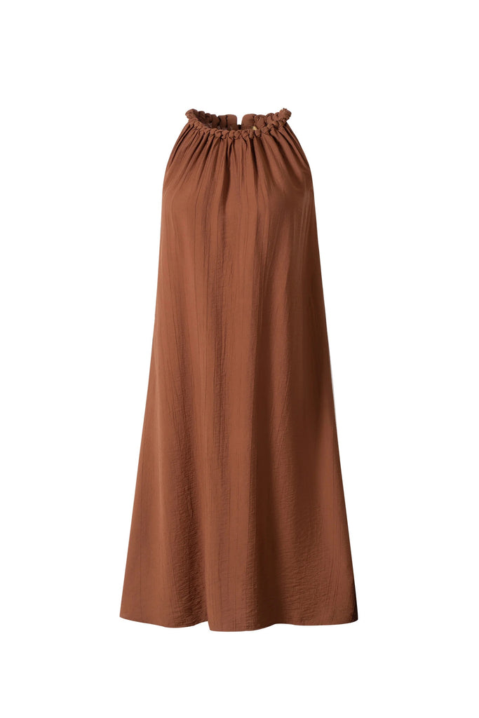 A distinctive gathered halter neckline cinched with a narrow ruched band, creating soft pleats that fall from the collarbone downward.